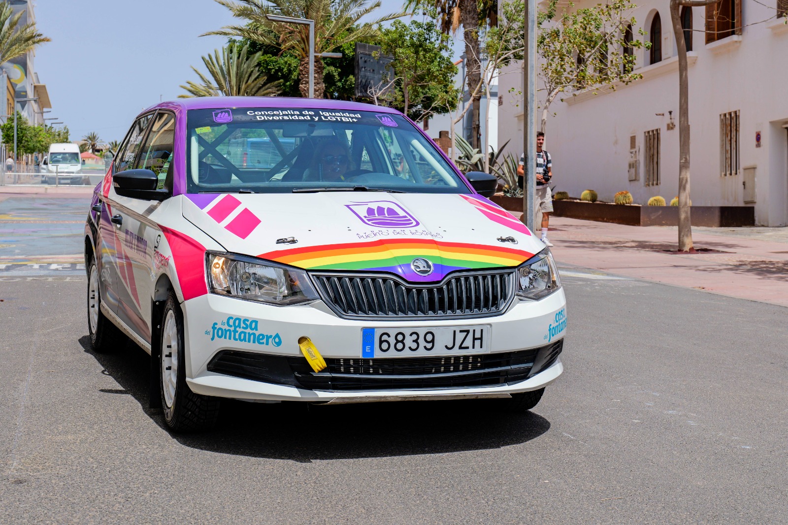 Durante un acto celebrado este miércoles frente al Ayuntamiento, se presentó un coche de competición que lleva serigrafiados el logotipo del consistorio y la bandera LGTBI, simbolizando el compromiso con esta causa. El evento contó con la presencia de la concejala de Igualdad, Tacoremi Gutiérrez, la concejala de Participación Ciudadana, Jenifer Pérez, así como la piloto Virginia de León y su copiloto, Ithaisa Marrero.