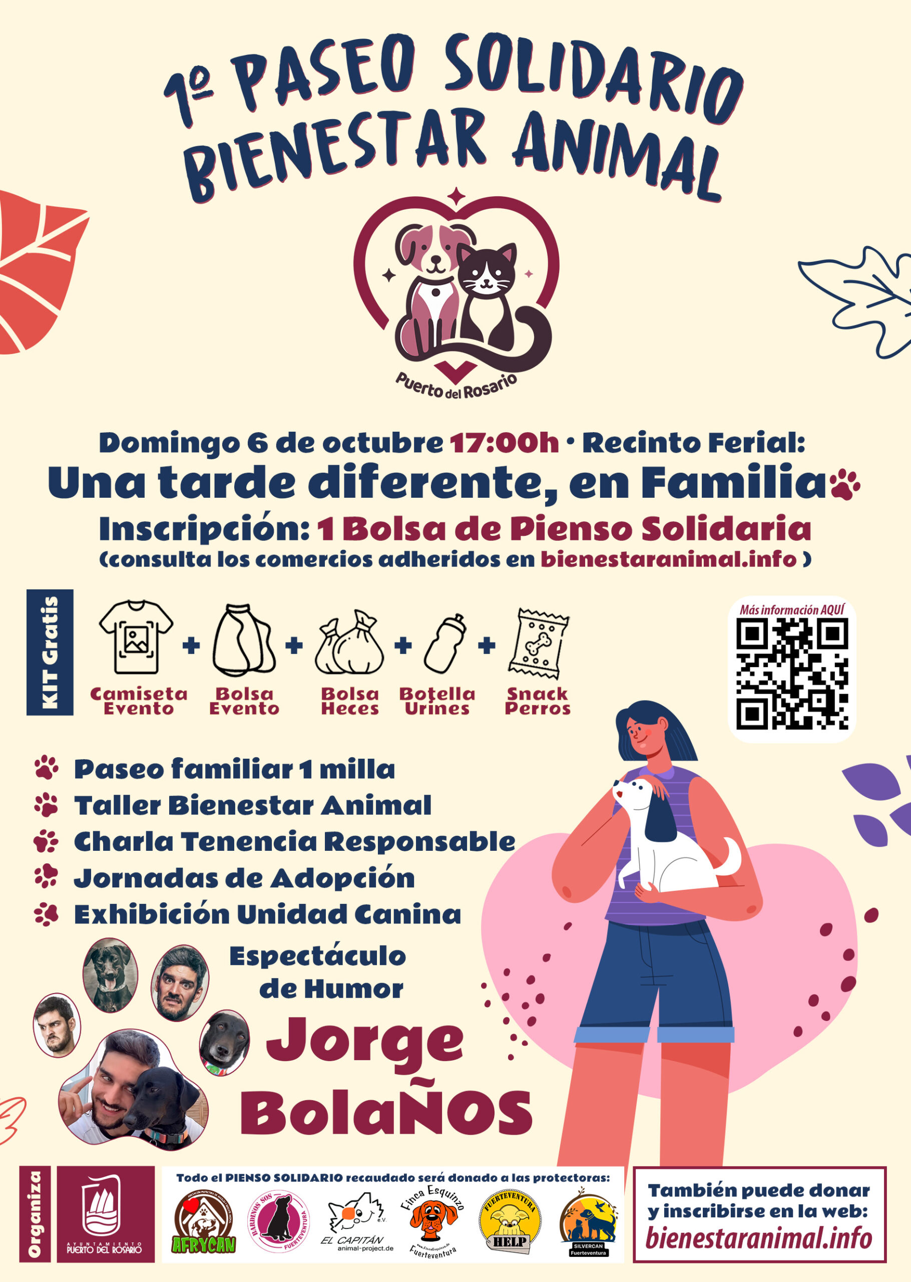 El paseo solidario recorrerá una milla y contará con una serie de actividades complementarias, como talleres de bienestar animal, charlas sobre la tenencia responsable de mascotas y jornadas de adopción, en las que se ofrecerá la posibilidad de dar un hogar a animales que lo necesitan. También habrá una exhibición de la Unidad Canina y, para cerrar el día, el joven cómico canario Jorge Bolaños protagonizará un espectáculo especial. Bolaños, conocido por su estilo fresco y dinámico, incluirá a su inseparable perra Risa en la actuación, reflejando el vínculo especial que comparte con su mascota y su apoyo a la causa del bienestar animal.