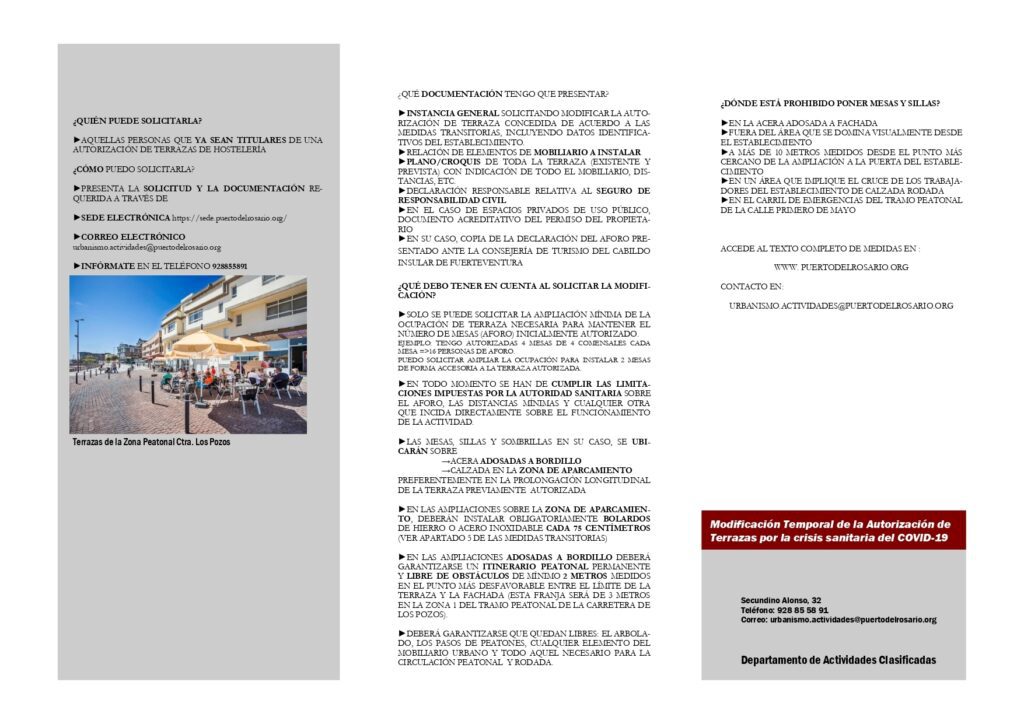 Las personas titulares de los establecimientos podrán solicitar esta ampliación ante el Ayuntamiento a través de la sede electrónica municipal, o bien a través del teléfono 928 85 58 91, o mediante el correo electrónico: urbanismo.actividades@puertodelrosario.org, aportando junto con la solicitud un plano de la ocupación con indicación de todos los elementos que se pretendan instalar y la declaración responsable de que cuenta con la póliza de seguro de responsabilidad civil correspondiente.