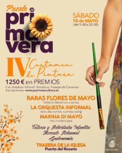 Uno de los principales atractivos será el IV Certamen de Pintura Rápida de Puerto del Rosario, que este año girará en torno al tema “Paisajes de Canarias”. Las inscripciones ya están abiertas hasta el 9 de mayo a las 18:00 h y pueden realizarse a través de la web oficial www.puertoescultura.es. El certamen está dirigido a participantes de todas las edades y se divide en dos categorías: Adultos e Infantil/Juvenil, con 1.250 euros en premios, entre dotaciones económicas y material artístico.