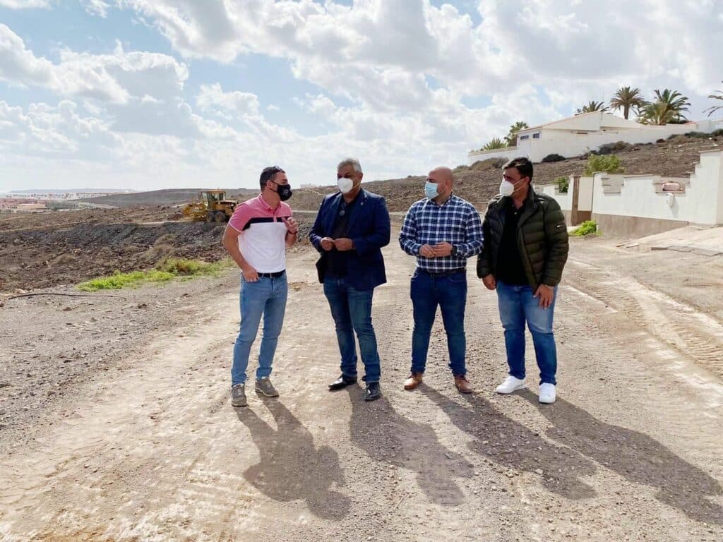 El alcalde del Ayuntamiento portuense, Juan Jiménez, acompañado del concejal de Obras, José Juan Herrera, y el concejal de Pueblos y Barrios, David Perdomo, visitaron en la mañana de este jueves, 14 de enero, los trabajos de acondicionamiento con recebe que se vienen acometiendo estos últimos días en la pista de tierra de Playa Blanca por parte de la empresa contratista Crispal Islas S.L.