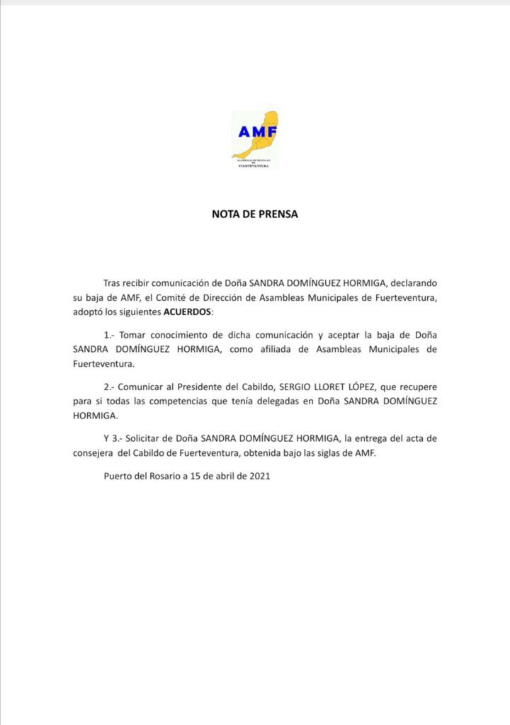 El mismo órgano acordó, asimismo, solicitar a Domínguez que entregue «el acta de consejera del Cabildo de Fuerteventura, obtenida bajo las siglas de AMF.