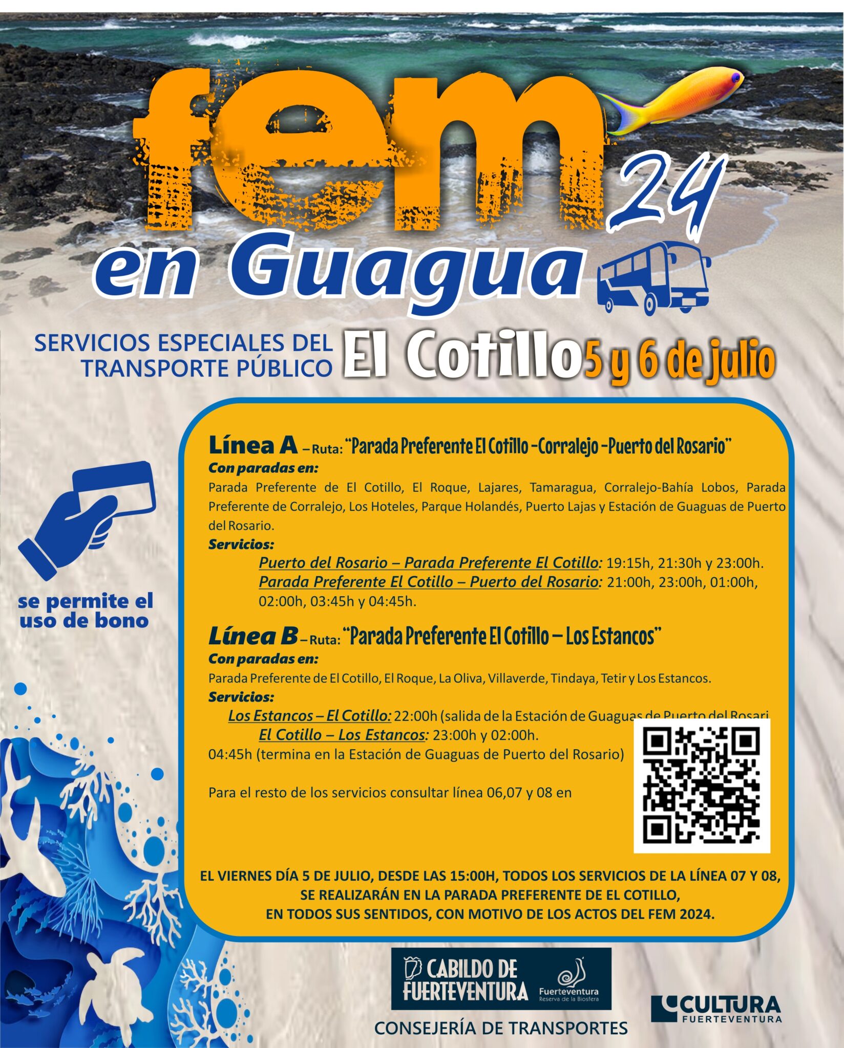 El Cabildo recuerda que los usuarios pueden utilizar el bono transporte para estos servicios especiales. Debido a la gran afluencia de vehículos y caravanas que dificultan los accesos, se ha decidido inactivar la parada de la Ermita de Cotillo por motivos de seguridad. Todos los servicios de las líneas 07 y 08, en ambos sentidos, se realizarán en la Parada Preferente El Cotillo a partir del viernes 5 de julio a las 15:00 horas.