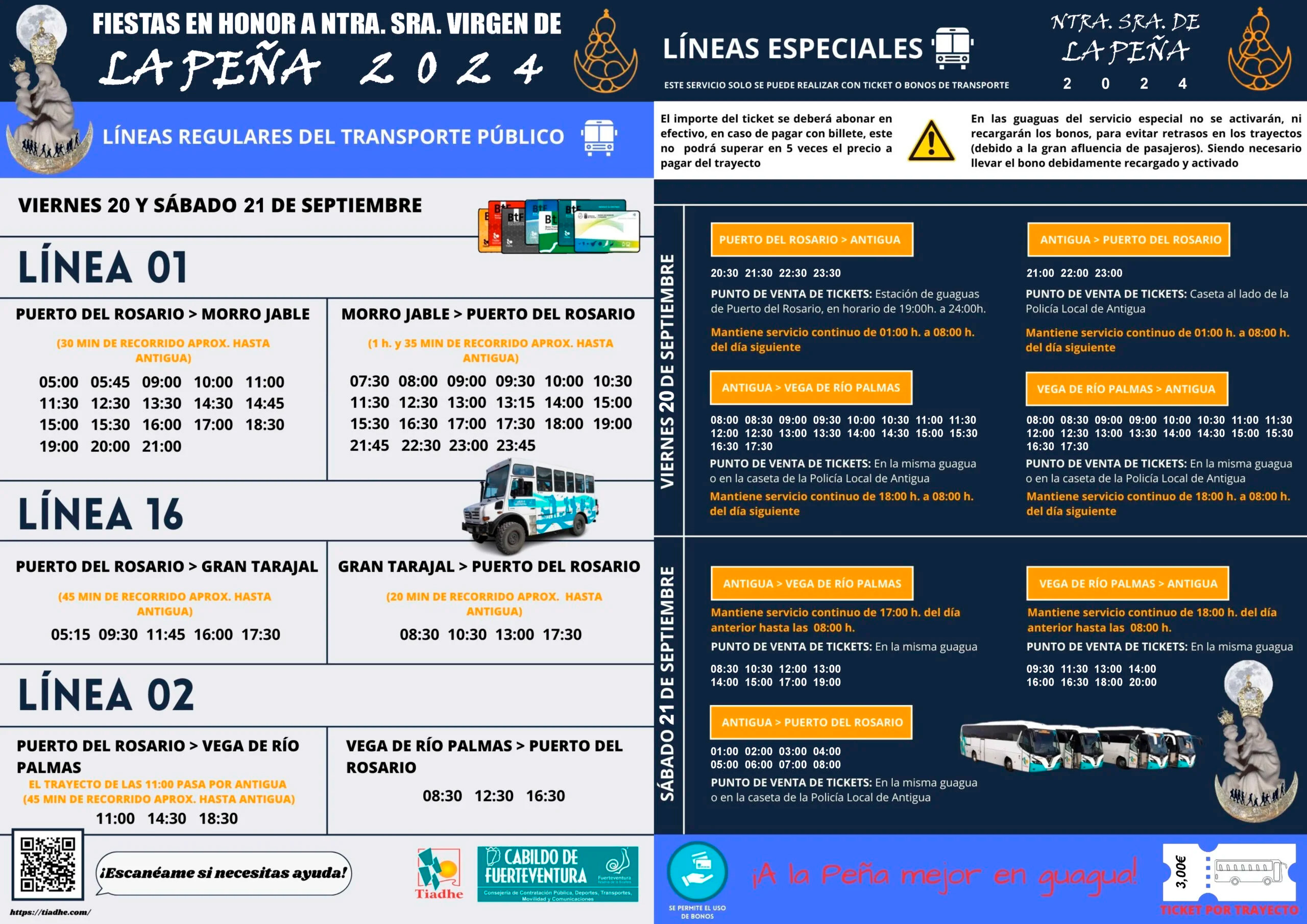 El Cabildo de Fuerteventura, en colaboración con la empresa concesionaria Next Continental Holdings, ha establecido un servicio especial de guaguas los días 20 y 21 de septiembre. Este servicio facilitará el acceso a los eventos de las fiestas. Los interesados pueden consultar los horarios y rutas en la página oficial: culturafuerteventura.es.