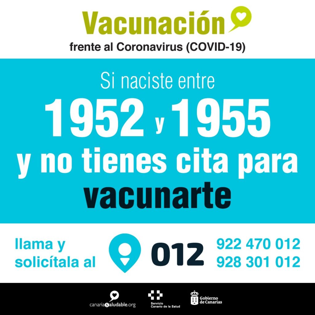 La Consejería de Sanidad del Gobierno de Canarias informa que desde hoy viernes, 16 de abril de 2021, las personas nacidas entre 1952 y 1955 que no hayan sido citadas para vacunarse contra la COVID-19 pueden llamar al 012 o al 928 301 012 0 922 470 012 para pedir cita, tal como se hace habitualmente para la vacunación contra la gripe. Este sistema de citación con el que el Servicio Canario de la Salud pretende agilizar el proceso de inoculación de la vacuna entre la población diana que se encuentra entre los 66 y 69 años, se suma al envío de sms y llamadas que se realizan como protocolo habitual de aviso a la población diana.