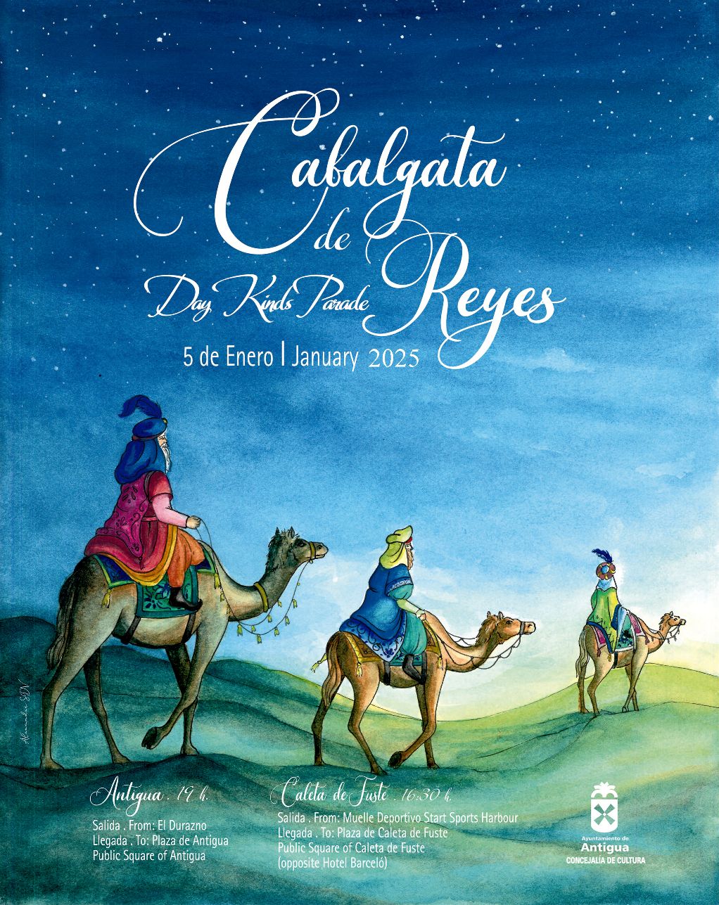 En su periplo de viaje escuchando todas las peticiones, llegarán a Antigua por la montaña, entrando por el Durazno sobre las 19:00 horas para bajar en cabalgata por las calles y llegar a la plaza de la iglesia, donde entre luminosas luces de Navidad, música y numerosas sorpresas, escucharán sin prisa pero sin pausa, las frases cortas y emocionadas de los más peques como de los más grandes.