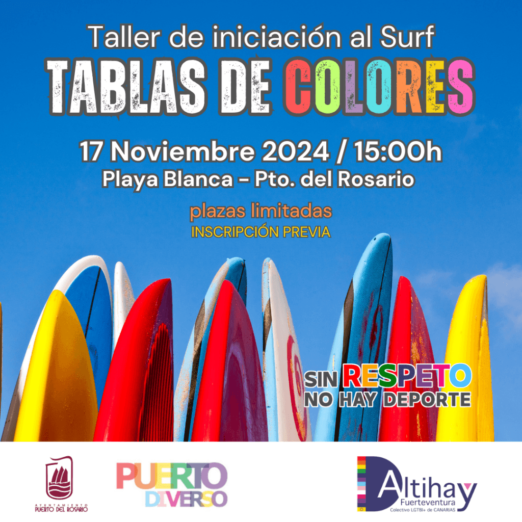 El Ayuntamiento de Puerto del Rosario informa, que se trata de una actividad financiada por la Concejalía de Igualdad, Diversidad y LGTBI+ del Ayuntamiento Puerto del Rosario, a través del Convenio Puerto Diverso 2024 bajo el título :Taller de iniciación al Surf ¨Tablas de Colores¨.