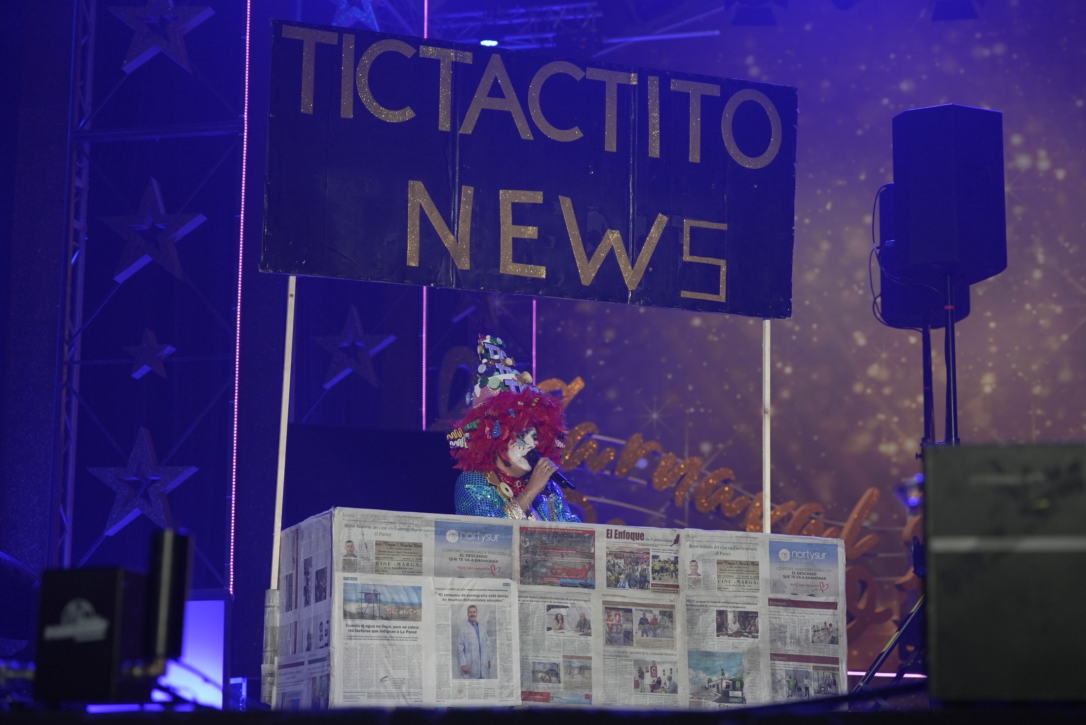Tras una presentación centrada en el aniversario y en la importancia de la cantera, la murga dio paso a su bloque principal: el informativo satírico. Desde el inicio dejaron clara su intención. “Un informativo joven, divertido y muy serio… con la información aquí no hay bulos”, anunciaron, antes de empezar a desgranar titulares.