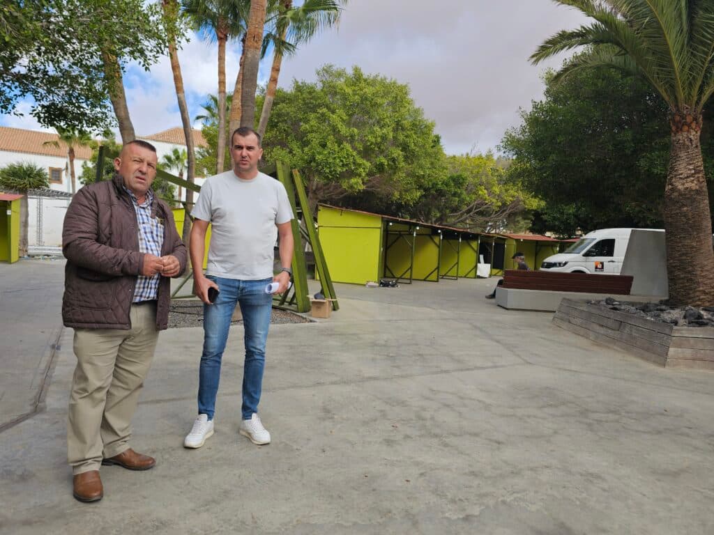 El alcalde, Matías Peña y el concejal de Cultura, Jonathan Peña revisan las últimas labores de montaje y decoración de la plaza de Antigua, que acoge este fin de semana el IV Encuentro y Venta de Artesanía.