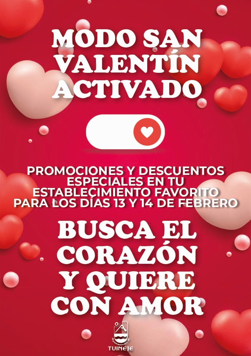 La concejalía de Comercio del Ayuntamiento de Tuineje ha lanzado la campaña ‘Modo San Valentín Activado’, una iniciativa destinada a impulsar el comercio local durante los días previos al Día de los Enamorados. Los vecinos podrán disfrutar de promociones y descuentos especiales en sus establecimientos favoritos durante el 13 y 14 de febrero. Con el lema ‘Busca el corazón y quiere con amor’, esta acción busca dinamizar la economía del municipio y reforzar el vínculo entre los negocios de proximidad y los vecinos.