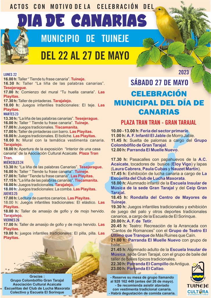 Con motivo del Día de Canarias, el Ayuntamiento de Tuineje, a través de la Concejalía de Cultura, ha preparado una programación especial con talleres y actividades en los diferentes centros culturales del municipio de forma abierta y gratuita. El sábado 27 de mayo se culminará con una jornada especial desde las 10:00 horas a las 23:00 horas.