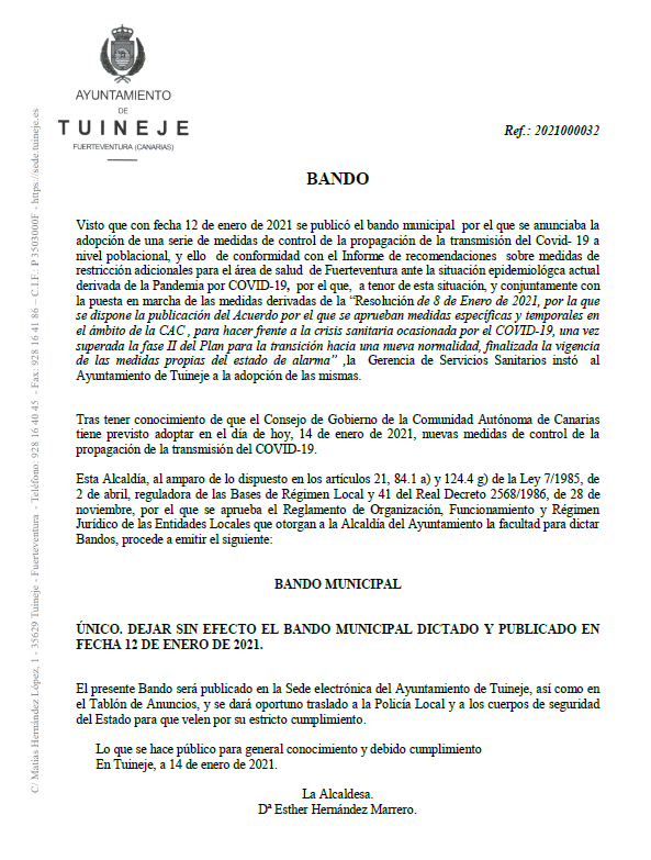 El Ayuntamiento de Tuineje deja sin efecto el bando de medidas extraordinarias para frenar la propagación de la COVID-19 ante el acuerdo que adoptará hoy el Gobierno de Canarias de declarar a la isla en nivel 2 de alerta sanitaria.