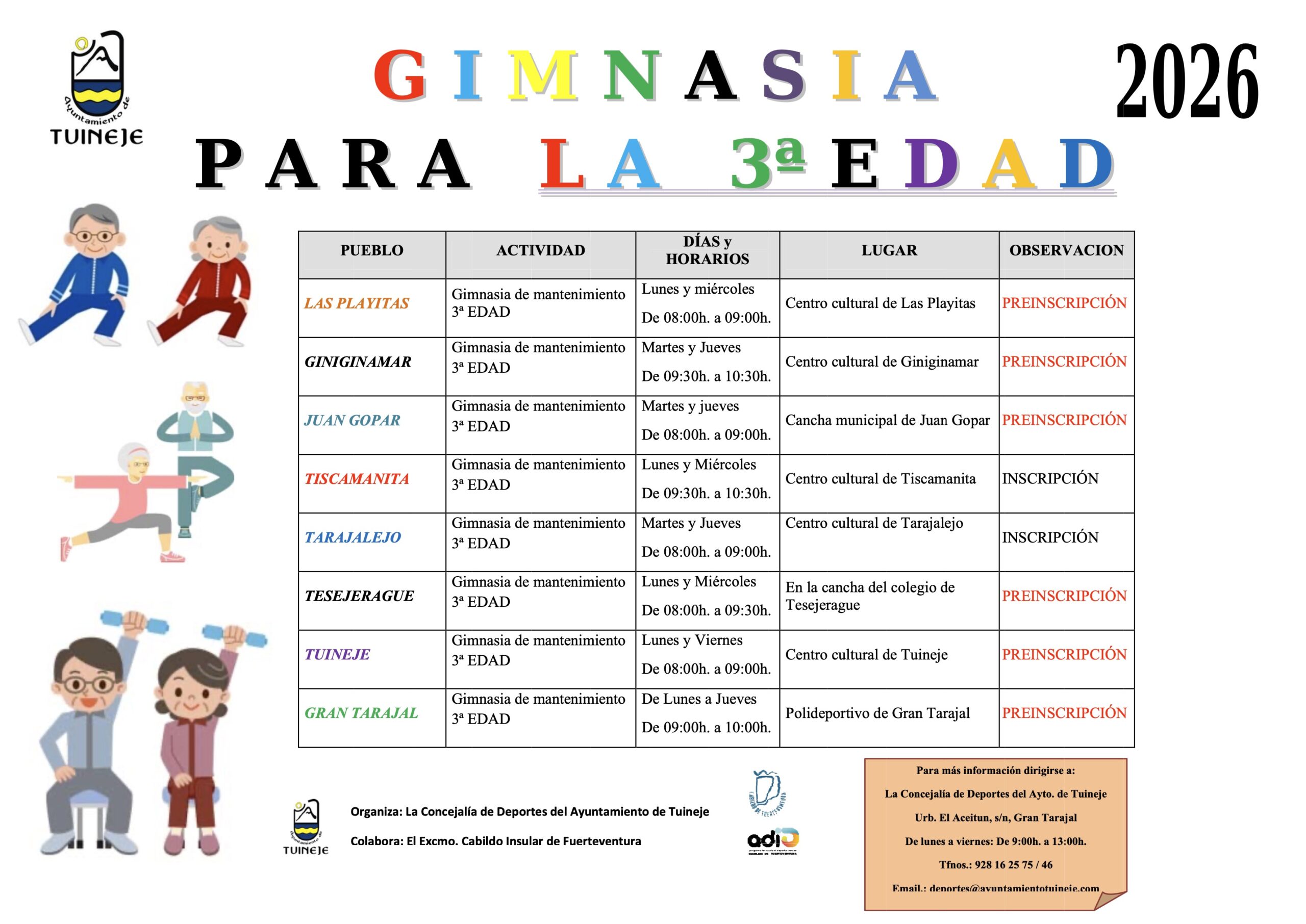 Para Tiscamanita, se contemplan clases lunes y miércoles de 09:30 a 10:30 en el Centro cultural de Tiscamanita; y en Tarajalejo, martes y jueves de 08:00 a 09:00 en el Centro cultural de Tarajalejo. En Tesejerague, la gimnasia figura lunes y miércoles de 08:00 a 09:30 en la cancha del colegio de Tesejerague. En el casco de Tuineje, el horario indicado es lunes y viernes de 08:00 a 09:00 en el Centro cultural de Tuineje; y en Gran Tarajal, de lunes a jueves de 09:00 a 10:00 en el Polideportivo de Gran Tarajal.