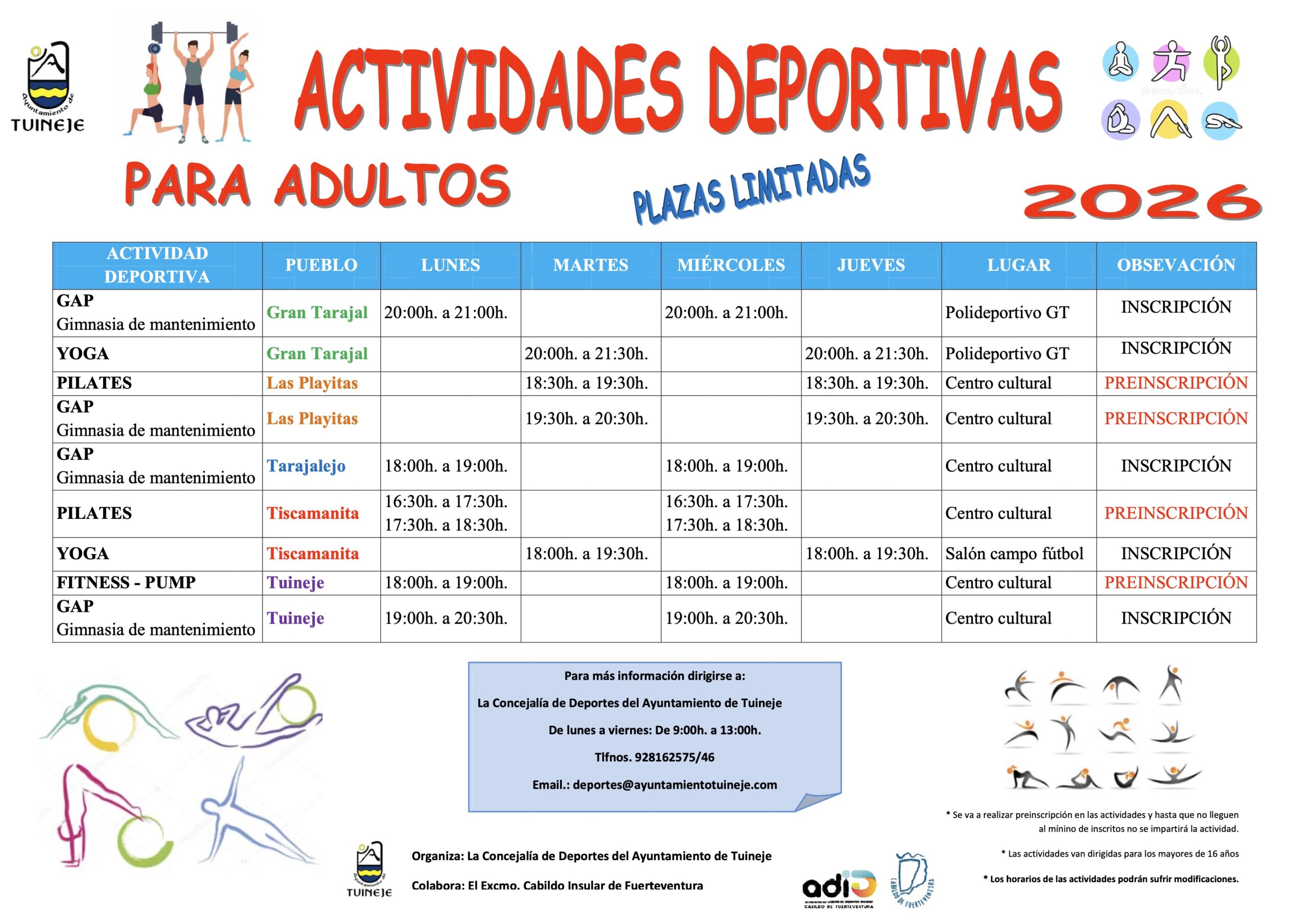 Paralelamente, el Ayuntamiento difunde un segundo programa de actividades deportivas para adultos, también con plazas limitadas, que incluye disciplinas como GAP, yoga, pilates y fitness-pump, con sesiones mayoritariamente en horario de tarde y distribuidas por núcleos como Gran Tarajal, Las Playitas, Tarajalejo, Tiscamanita y Tuineje.